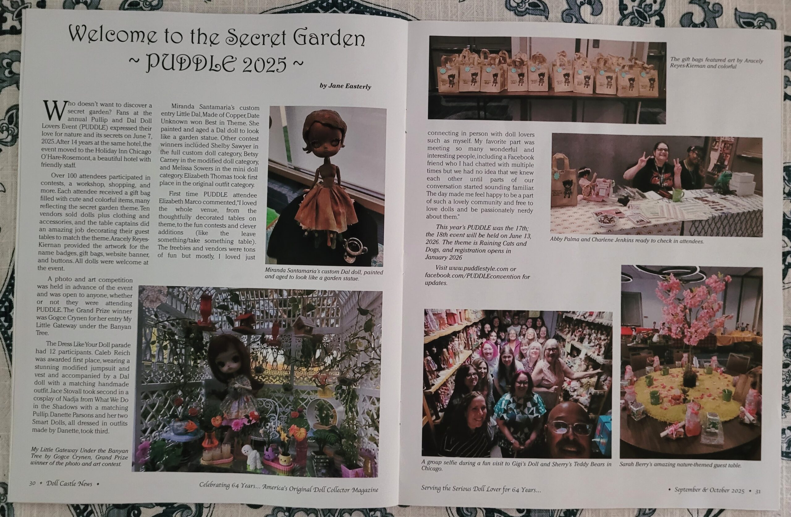 Over 100 attendees participated in contests, a workshop, shopping, and more. Each attendee received a gift bag filled with cute and colorful items, many reflecting the secret garden theme. Ten vendors sold dolls plus clothing and accessories for a variety of dolls, and the table captains did an amazing job decorating their guest tables to match the theme. Aracely Reyes-Kiernan provided the artwork for the name badges, gift bags, website banner, and buttons.